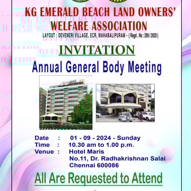Annual General Body Meeting on 01-09-2024 of KG Emerald Beach Land Owners Welfare Association conducted at Hotel Maris, Chennai.